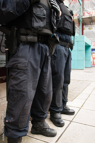 Two armed police officers stand guard on British streets.