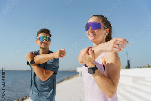 Two athletes perform arm stretches under the bright sun by the water, wearing sporty sunglasses.