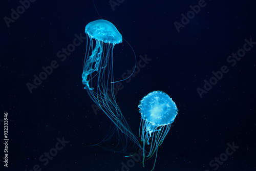 Two Atlantic sea nettle jellyfish, Chrysaora quinquecirrha, East Cost sea nettle, swims in illuminated aquarium with blue lighting. Theriology, biodiversity, undersea life, aquatic organism