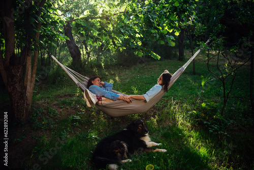 Two beautiful happy lesbian girls relax and hold hands in a hammock in the garden with their dog in the rays of the sun
