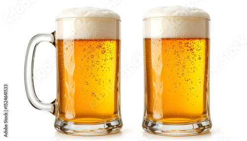 Two beer glasses isolated on white background. Mug filled with draft beer with bubbles and foam and an empty mug. Graphic design element for brewery ad, beer garden poster, flyers, printables