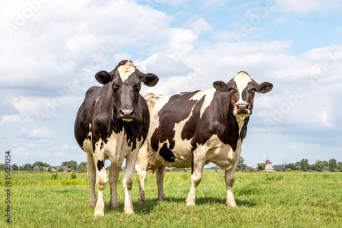 cow, together, friendship, cheerful, black-and-white, agriculture, black, bonding, cloud, complete, connection, country, countryside, cow, cosy, cute, dairy, dutch, elated, excited, field, green, happy, holland, holstein, horizon, landscape, farm animal, looking, love, meadow, mill, nature, holland, pasture, ruminate, rural, rustic, half face, sky, summer, support, suspicious, togetherness, udder, white, whole