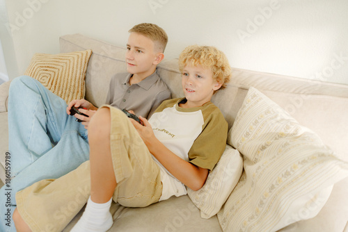 Two boys sit closely on a sofa, focused on playing video games. The room is light and bright, creating a cheerful atmosphere. They enjoy the moment of gaming together.