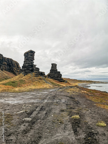 Two brothers rocks near Cape Zemlyanoi on the Kola Peninsula. Natural weathering pillars. The rocky coast of the Barents Sea. The ancient sanctuary of the Sami. Arctic Russia.