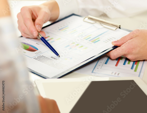 two business partners discussing documents lying.