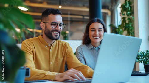 Two business professionals are seated side by side at a desk in a modern office, intently working on a laptop. The man in glasses leans forward, smiling as he discusses something w