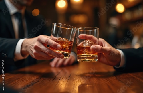 Two businessmen in suits toasting glasses of whiskey with ice at bar, celebrating success, or closing deal. Alcoholic beverage in hands. Corporate event at fancy restaurant. Happy hour.