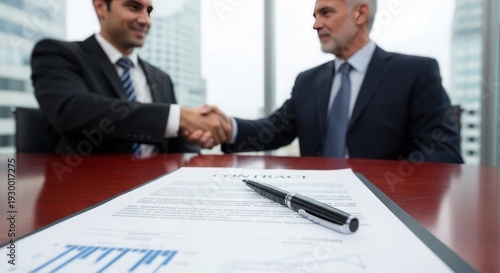 Two businessmen shaking hands over a contract on a mahogany table in a modern office with a cityscape view