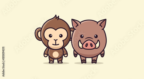 Two cartoon animal friends, a monkey and a boar, side-by-side on a light background