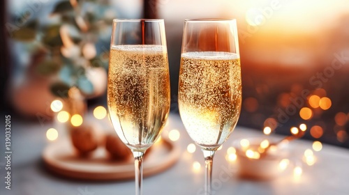 Two champagne flutes filled with bubbly liquid, creating a festive and celebratory atmosphere.