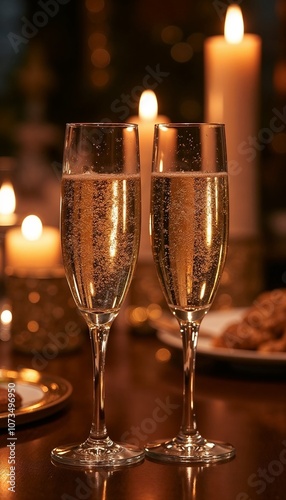 Two champagne flutes filled with sparkling drink, surrounded by candles and festive atmosphere