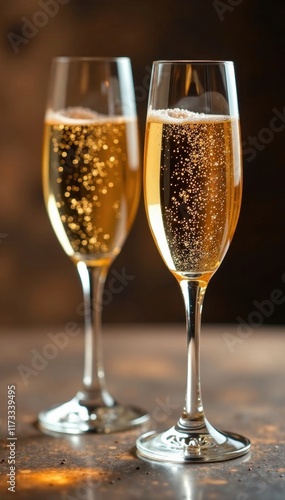 Two champagne glasses filled to the brim, light reflecting, achievement, party, toast