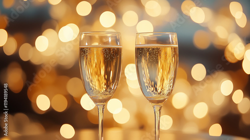 Two Champagne Glasses with Golden Lights in Festive Background