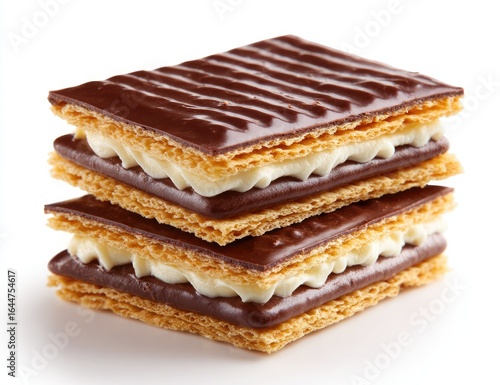 chocolate, cookie, sandwich, dessert, sweet, layered, cream, filling, brown, delicious, crispy, gold, stacked, food, baked, treat, whipped, vanilla, creamy, topping, biscuit, layer, food photography, isolated, white, background, closeup, horizontal, texture, light, snack