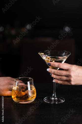 Two cocktails in hand on a dark background. A man's hand and woman's hand holds a glass of cocktails on bar counter