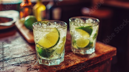 Two cocktails with ice cubes and lime slices in glasses on an old wooden table, highlighting color contrast and frothy texture from stirring, evoking anticipation for trying new drinks at a bar.