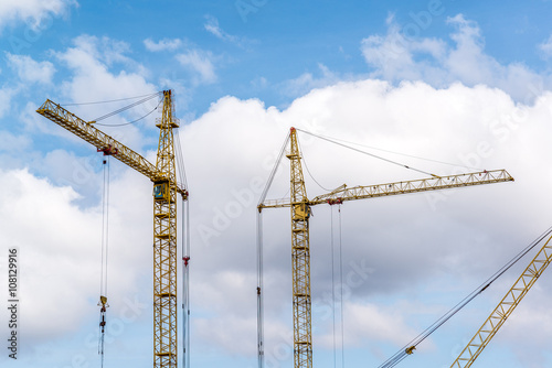 crane, construction, yellow, tower, boom, 2, building, sky, beautiful, cloudy, day, sunny, nobody, operation, mechanism, machine, design