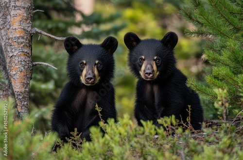 Two Curious Black Bear Cubs Surrounded by Lush Greenery in a Natural Forest Setting