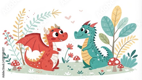 Two Cute Dragons in a Floral Garden Digital Illustration, Pastel Colors, Whimsical, Children's Book ,Dragons, Illustration