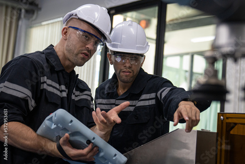 Two Diverse Professional Heavy Industry Engineers Wearing Safety Uniform and Hard Hats Working Industry and engineering people technology concept .