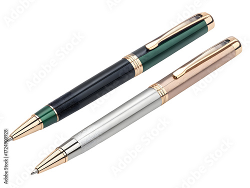 Two elegant ballpoint pens with gold accents and metallic finishes isolated on transparent background