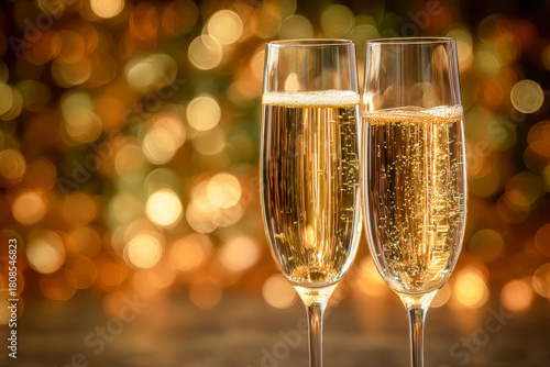 Two elegant flute glasses filled with sparkling golden champagne illuminated by warm festive bokeh lights in the background celebrating a special occasion