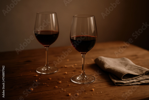 Two elegant wine glasses with red wine on rustic wooden table, soft warm lighting, linen napkin, cozy evening atmosphere