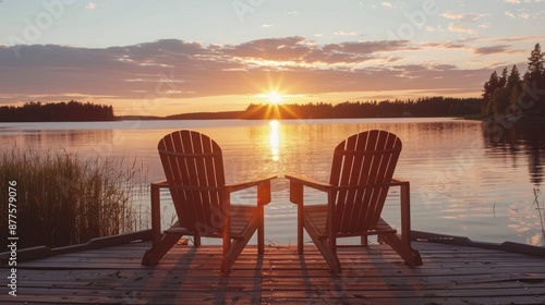 Two empty Adirondack chairs sit facing a sunset over a still lake