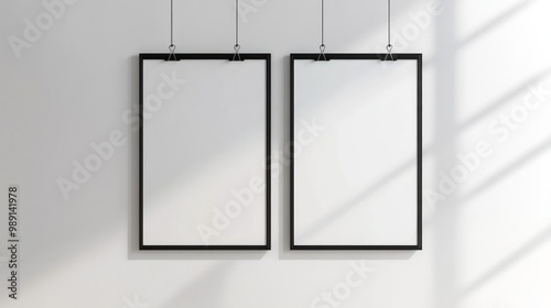 Two empty picture frames hanging on a wall, illuminated by natural light.