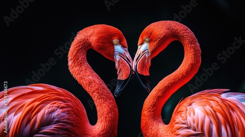Two flamingos in a synchronized dance, their necks gracefully curving into a heart shape.
