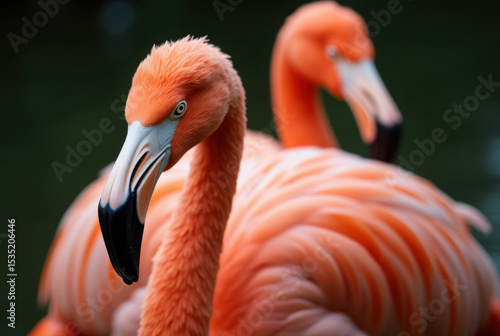 flamingo, bird, pink, orange, feather, plumage, beak, animal, wildlife, nature, zoo, aviary, tropical, exotic, colourful, vibrant, beauty, elegant, grace, pair, 2, ornithology, phoenicopteridae, wading bird, long neck, long legs, closeup, portrait, dark background, blurred background, detail