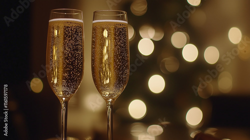 Two flutes of golden champagne with tiny bubbles rising, elegantly placed on a table with a bokeh background of twinkling fairy lights. Perfect for celebrations, luxury, or festive moments.