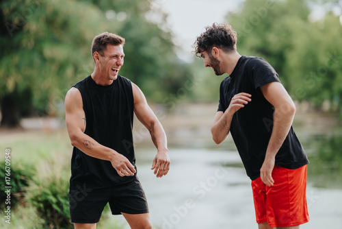 friends, man, man, outdoors, laughter, happy, joy, physical exercise, fitness, training, sport, active, energy, athlete, casual attire, black, shirt, shirt, short, red, park, lake, water, nature, tree, greenery, scenery, motion, candid, people, smile, smiling, fun, summer, breeze, sun, athletic, teamwork, buddy