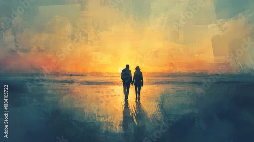impressionistic, artwork, friends, walking, sunset, beach, quiet, glowing, warm, tone, soft, texture, expressive, peaceful, emotional, serene, scenic, companionship, nature, horizon, light, atmospheric, tranquil, colourful, artistic, intimate, vibrant, harmonious, reflective, calming, symbolic, connection, landscape, idylli, golden hour, togetherness, natural beauty