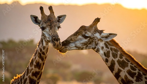 Two giraffes embrace at sunset, their long necks and patterned coats highlighted by the warm, golden light. A tender moment in nature
