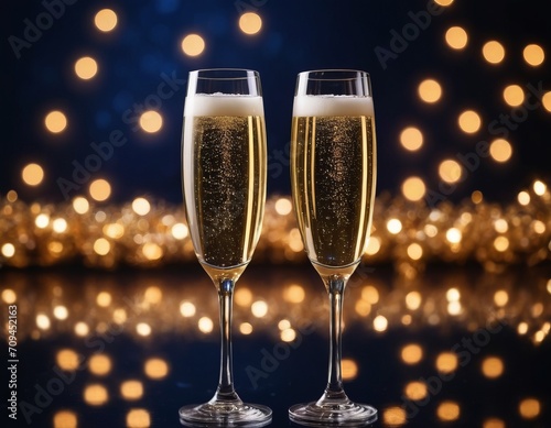 Two glasses of champagne close-up on a dark background with bokeh lights, glitter and sparks. Christmas celebration concept with place for text