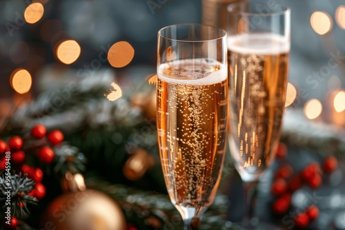 Two glasses of champagne with bubbles, surrounded by Christmas decorations, pine branches, and bokeh lights.
