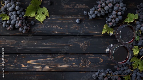 Two glasses of red wine surrounded by ripe grapes on an aged wooden background, depicting a harvest theme.