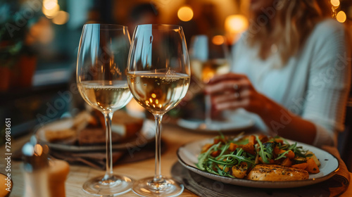 Two glasses of white wine on a table filled with plates of food. A couple are sitting at the table, smiling at each other.