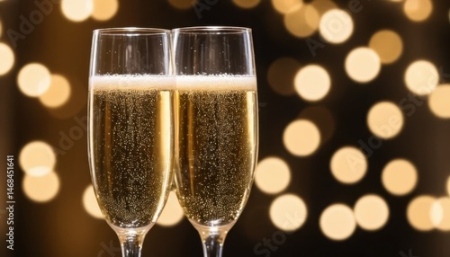 Two gold-rimmed crystal flutes of bubbly champagne celebrate a festive Christmas party with a miniature tree