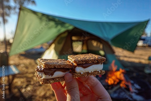 graham, cracker, marshmallow, chocolate, camping, tent, campfire, outdoors, sunny, hand, food, dessert, snack, delicious, hot, crispy, sweet, nature, vacation, picnic, roasted, treat, enjoy, relax, summer, autumn, brown, white, orange, gold, light, shade, green, fabric, wood, sand, dirt, closeup, view, holding, snacking, tasty, comfort, simple, rustic, leisure, outing, camp