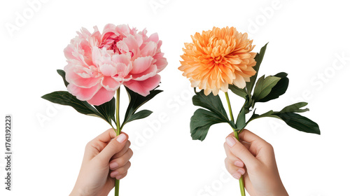 Two hands holding a pink peony and an orange dahlia isolated on transparent background