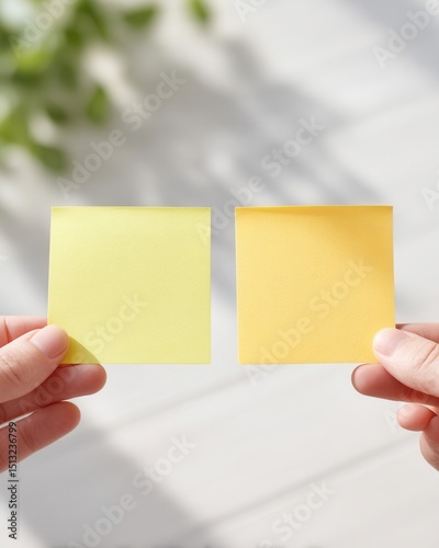Two hands holding yellow sticky notes in bright natural light.