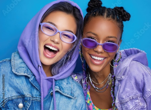 two happy, beautiful models in sunglasses, dressed in jeans and a purple jacket, having fun together on a light blue background