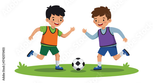 boy, children, children, soccer, football, game, sport, play, playing, field, grass, green, ball, kicking, running, active, energetic, happy, smiling, fun, recreation, leisure, childhood, youth, team, practice, training, competition, athletic, activewear, vest, short, shoe, movement, action, dynamic, illustration, cartoon, drawing, vector, graphic, simple, colourful, friendly, joy, excitement, healthy