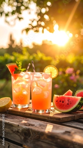Two iced drinks with watermelon and lemon slices, outdoors at sunset