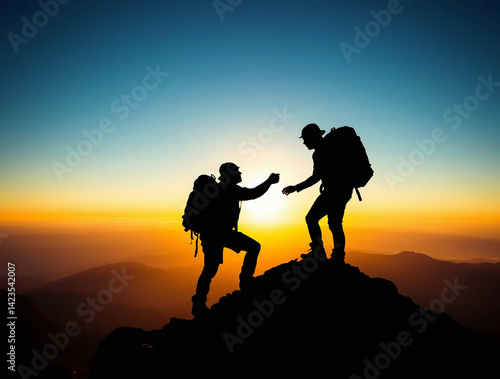 two individuals on a mountain peak during sunset. The layout features one person reaching down to help the other climb up, both wearing backpacks and climbing gear