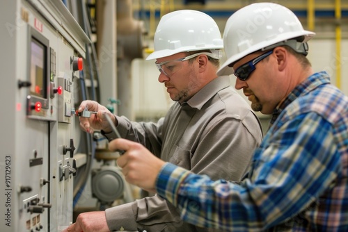 men at work, men at work, industrial, factory, control, panel, paneling, man, man, inspecting, examining, checking, operating, working, maintenance, safety, gear, hard hat, helmet, helmet, protective, equipment, goggles, goggles, white, blue, plaid, shirt, shirt, metal, machinery, technology, manufacturing, production, plant, business, team, teamwork