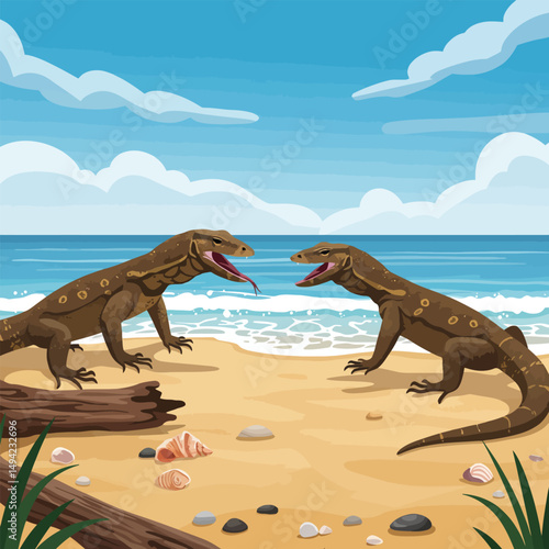 Two Lizards Standing on Sandy Beach Near Ocean with Blue Sky