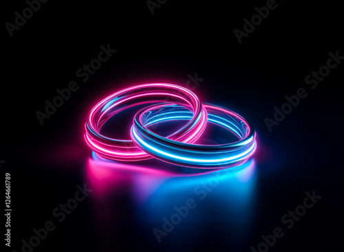 Two luminous rings, intertwined and glowing with vibrant pink and blue neon light against a stark black backdrop. The rings appear metallic with a smooth, reflective surface.